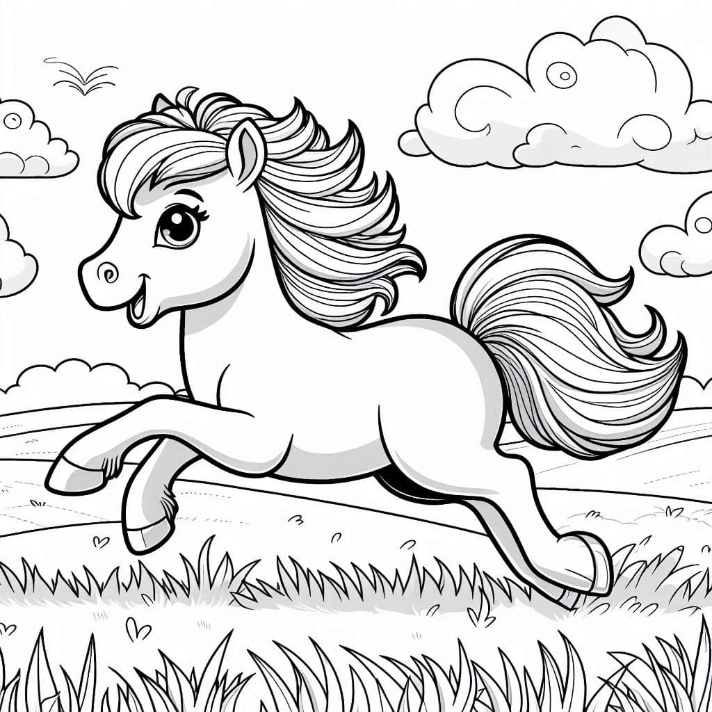 A cheerful pony runs through the open field.