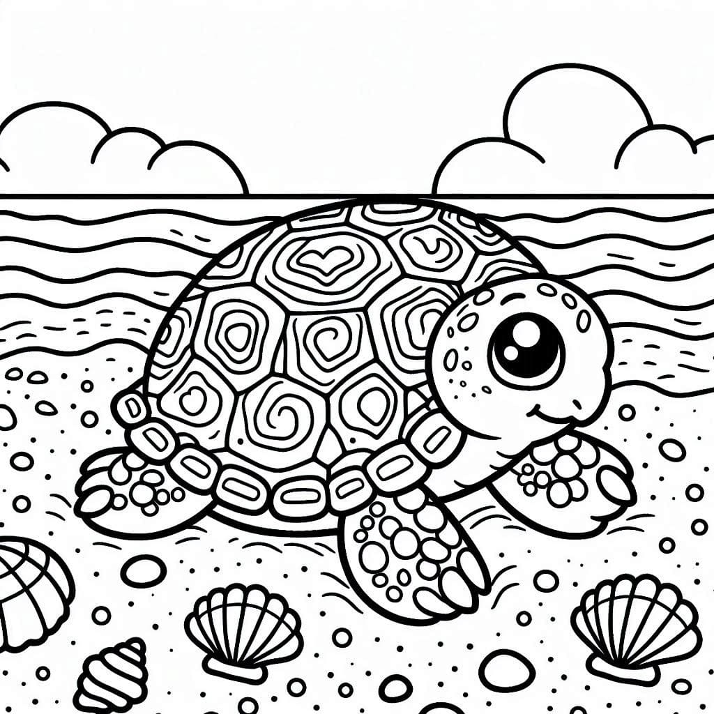 A happy turtle explores the sandy shore.