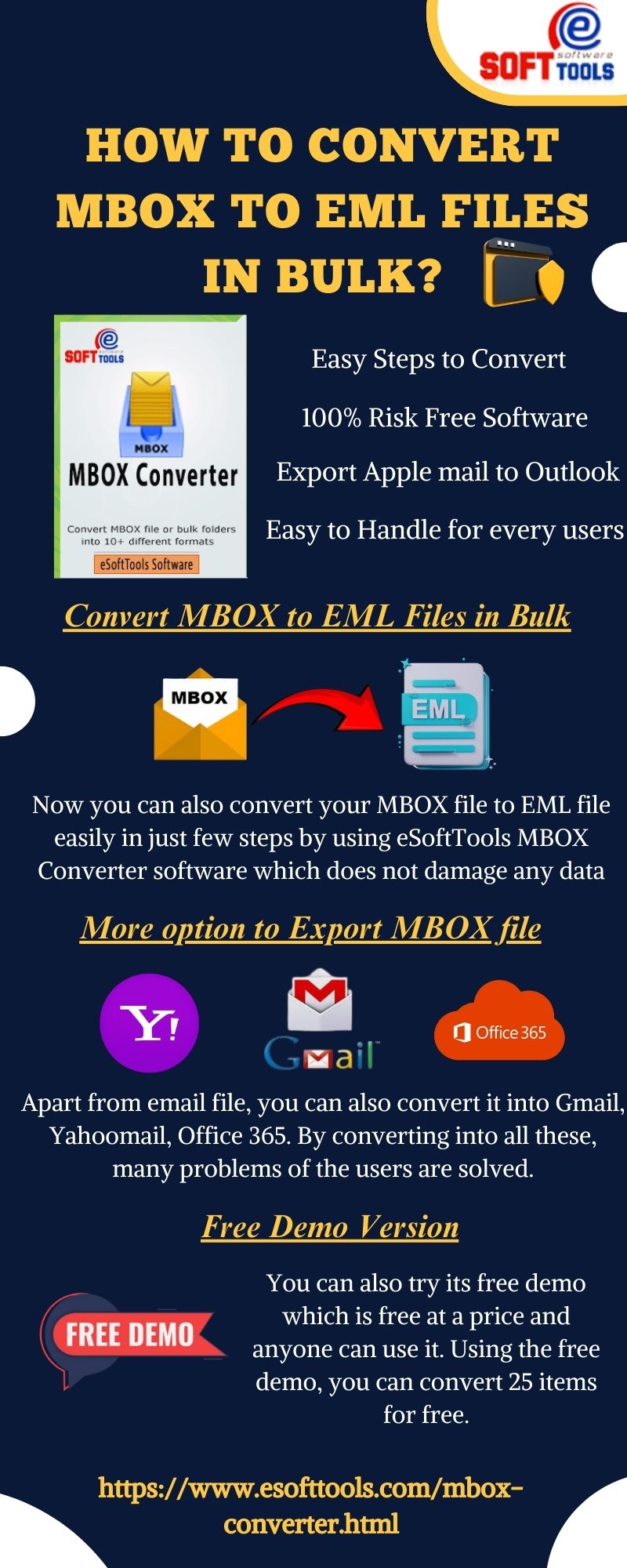 eSoftTools MBOX Converter Software. Many email clients like Thunderbird, Apple Mail, Eudora, and SeaMonkey store mailbox data in MBOX format, but sometimes users need to access their emails in other clients that support EML files, such as Windows Live Mail, Outlook Express, or Foxmail. Unfortunately, manual methods cannot handle bulk MBOX to EML conversion efficiently and often lead to data loss or formatting issues. That's why a professional solution like eSoftTools MBOX Converter is highly recommended.
