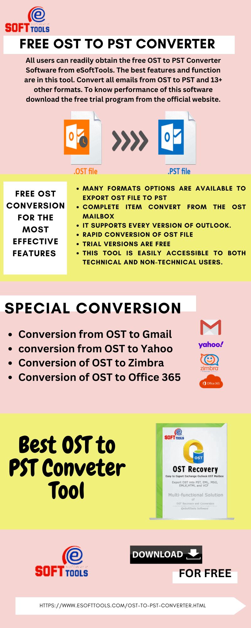 eSoftTools OST to PST Converter software. With this software, users export OST emails to PST, MBOX, EML, Office 365, Gmail, YahooMail, IMAP Accounts, and other file formats. Also, this software can help users convert OST with Emails, Contacts, Calendars, Notes, Tasks, and all other Outlook items. This software also supports all Windows O/S editions like- 11, 10, 8.1, 8, 7, XP, Vista, and older editions.