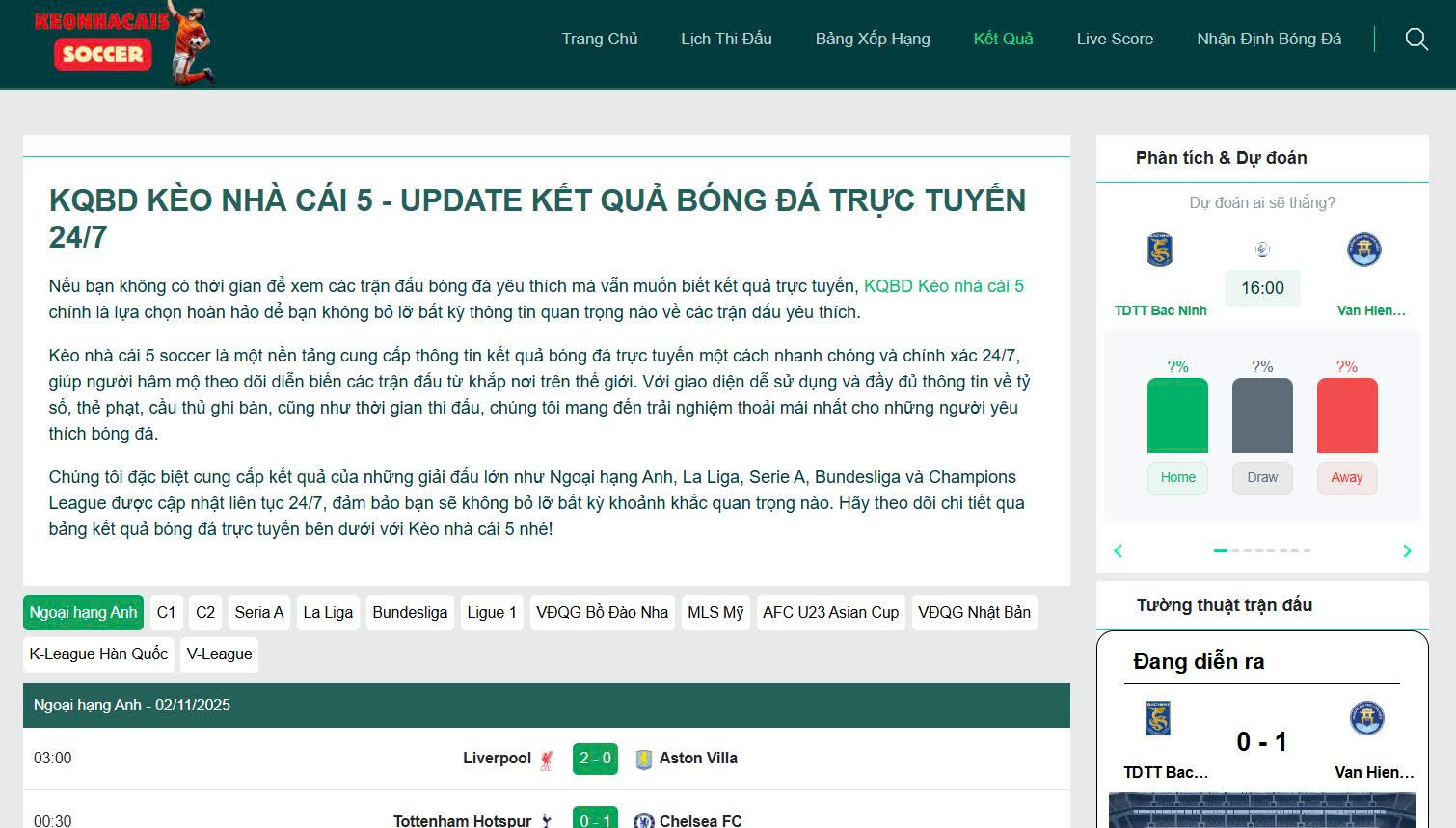 KQBD Kèo nhà cái 5 là một trong những thông tin mà người chơi cá cược bóng đá luôn tìm kiếm. Việc cập nhật kèo nhà cái và kết quả bóng đá nhanh chóng giúp người chơi có thể đưa ra những quyết định chính xác hơn trong việc đặt cược. KQBD Kèo nhà cái 5 không chỉ là kết quả trận đấu mà còn phản ánh tỷ lệ kèo, biến động kèo trước khi trận đấu diễn ra.