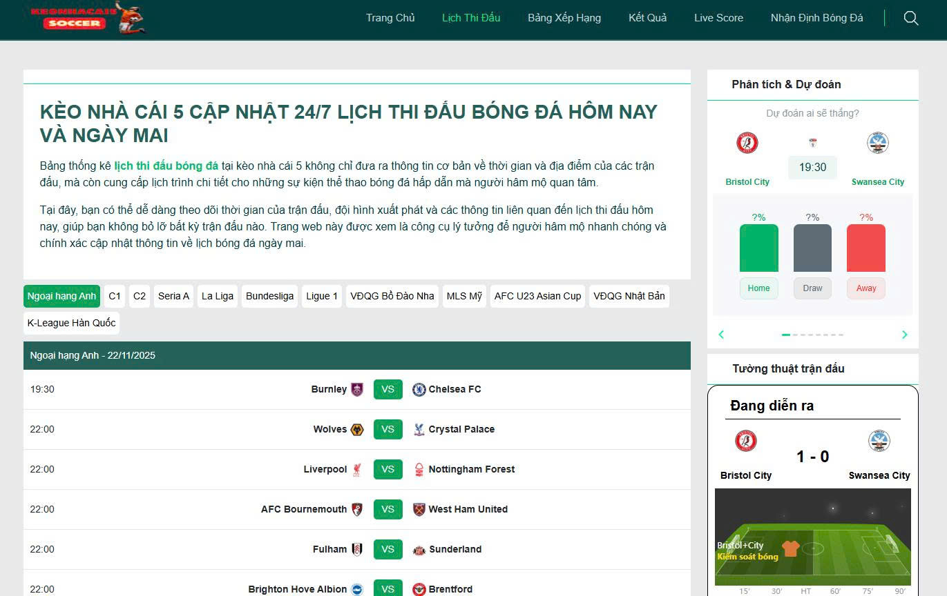 Lịch thi đấu bóng đá luôn là chủ đề khiến người hâm mộ tìm kiếm mỗi ngày bởi vì nó không chỉ đơn thuần là thông tin về thời gian diễn ra trận đấu mà còn là cảm xúc chờ đợi và háo hức theo từng vòng bóng. Khi một mùa giải mới bắt đầu người xem lại tất bật cập nhật lịch thi đấu bóng đá để biết đội bóng yêu thích của mình sẽ ra sân khi nào. Điều này đã trở thành thói quen quen thuộc của người đam mê môn thể thao vua.