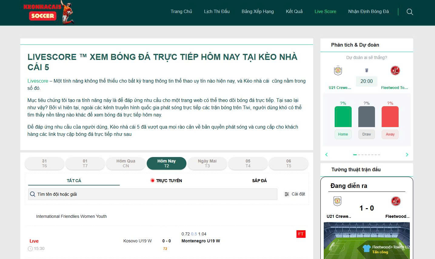 Livescore là một công cụ trực tuyến giúp người hâm mộ thể thao theo dõi kết quả trận đấu nhanh chóng và chính xác. Khi tham gia vào các trận đấu bóng đá, bóng rổ hay quần vợt, người hâm mộ thường không có thời gian xem trực tiếp toàn bộ trận đấu. Livescore cung cấp thông tin cập nhật theo thời gian thực, từ đó giúp người xem nắm bắt tình hình trận đấu ngay cả khi không thể xem truyền hình trực tiếp.