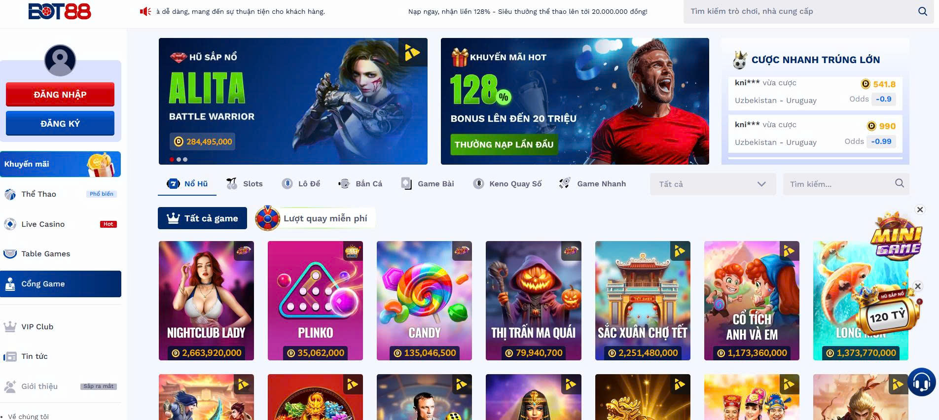 Một lợi thế khác của Cổng Game Nổ Hũ tại Bot88 là chương trình khuyến mãi và ưu đãi hấp dẫn. Người chơi mới có thể nhận thưởng ngay khi đăng ký, trong khi các thành viên lâu năm sẽ được tham gia nhiều sự kiện đặc biệt để nhận thêm phần thưởng giá trị. Điều này không chỉ tăng thêm phần thú vị khi chơi mà còn giúp người chơi có thêm cơ hội tích lũy và thử vận may.
